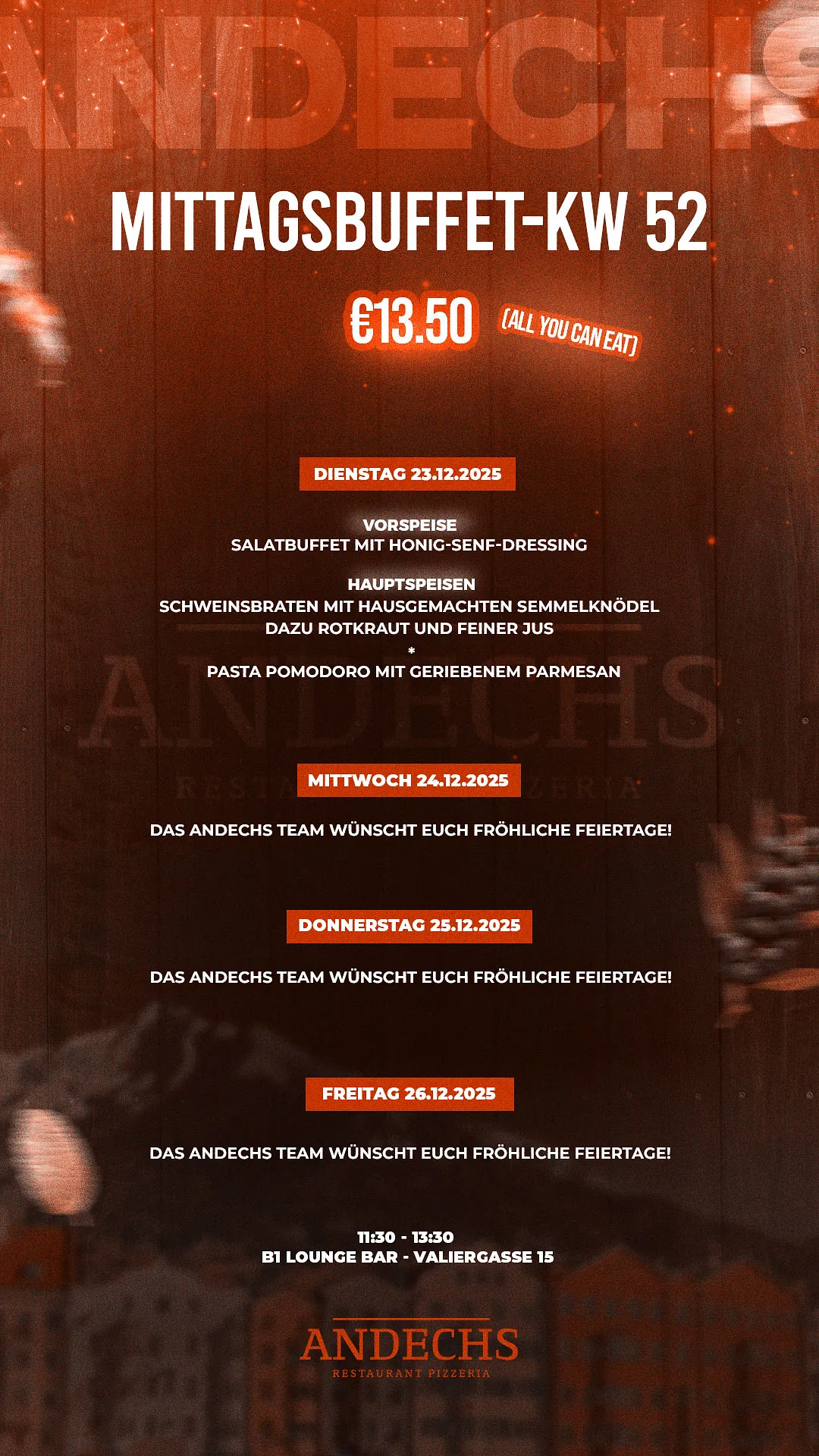 Entdecke unser Buffet und lass dich von der Qualität und Frische unserer Gerichte begeistern. Wir freuen uns darauf, dich bald als Gast begrüßen zu dürfen und deinen Mittag zu etwas ganz Besonderem zu machen.