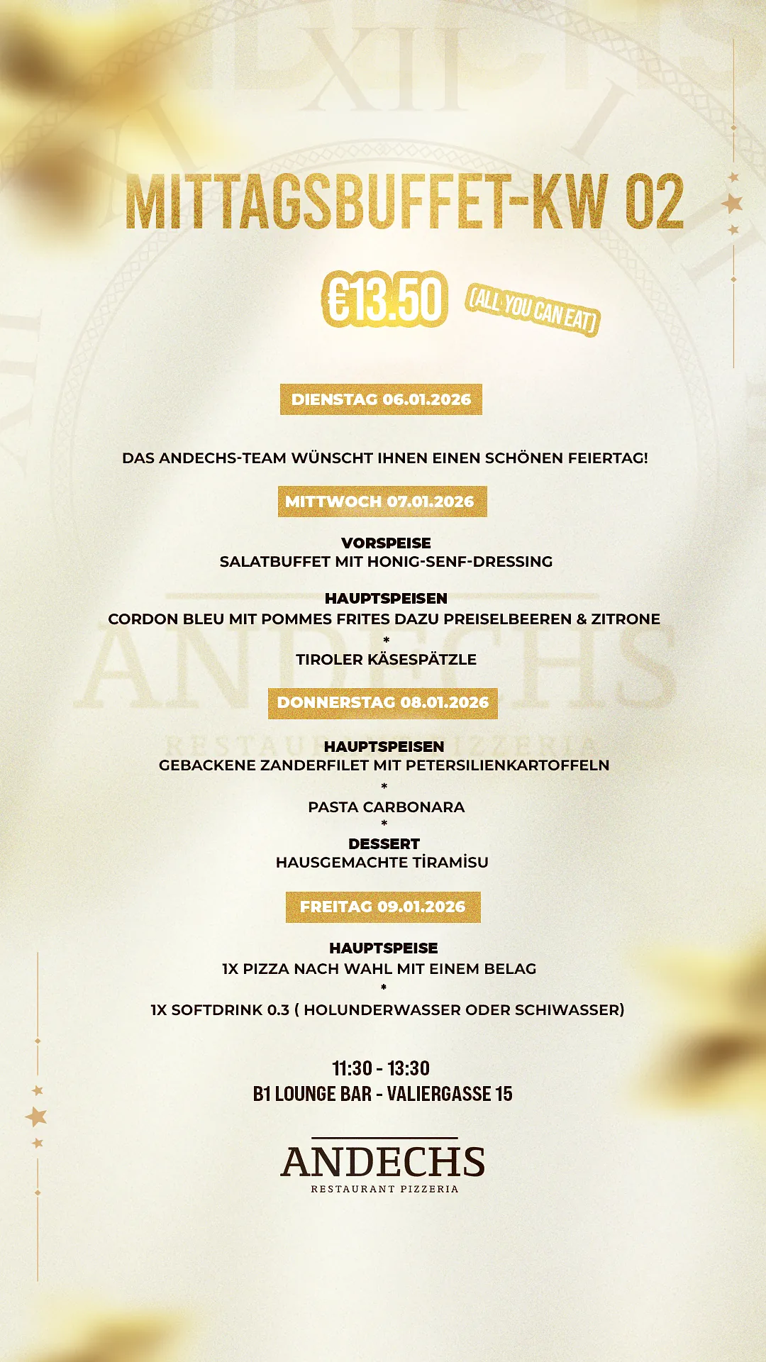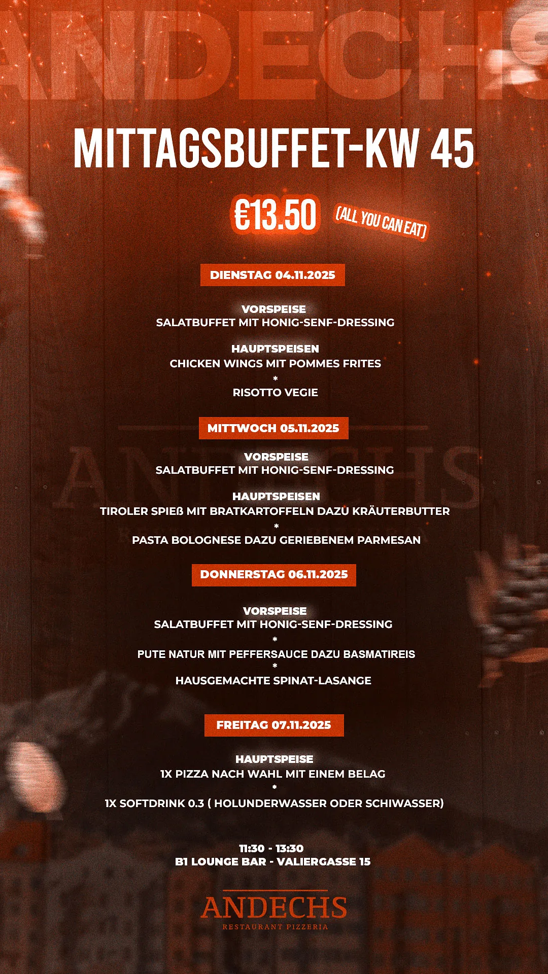 Unser Mittagsbuffet ist die perfekte Wahl für alle, die eine qualitativ hochwertige Mahlzeit zu einem attraktiven Preis genießen möchten. Wir bieten dir eine abwechslungsreiche Auswahl an Gerichten, die speziell dafür konzipiert sind, deinen Mittag zu einem Highlight des Tages zu machen.